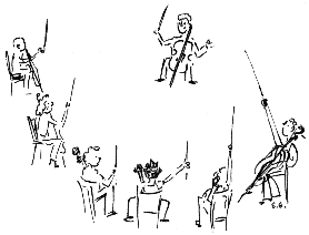 ![]() NOW make the repertoire connection: with the same energy as in the above exercise, play this Rubbing Détaché ![]() Next ![]() Apply the same energy you used in the above finger-pointing gesture to this repertoire exerpt from.the Brahms "Double" Concerto( measure 2l8): ![]() You will now be able to play this Martelé ("YOU AND YOU, YOU AND YOU!") HW: Class, I want you, when you return home, to think of other examples of hand gestures triggering and energizing your bow strokes. The Joy of Cello Playing, Master Lesson 2, contains many more scenarios that let you practice the connection between hand gestures and a much more expressive and colorful bow technique. |